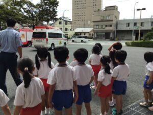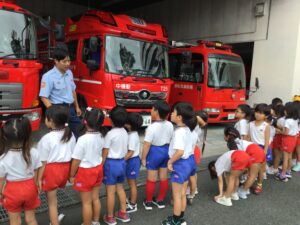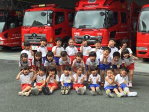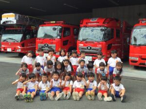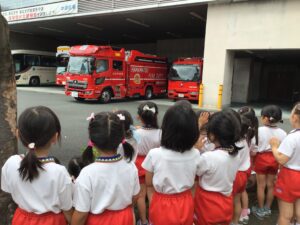 本日は年長組が浜松市中消防署に社会見学に出かけました。何日も前から消防署や緊急車両の写真を見ながら会話を楽しんでいると、「消防ヘリってあるかなぁ?」「僕ははしご車が見たい!はしご車って何台あるの?」「寝るところはあるのかな?」「ご飯はちゃんと食べられる?」など各クラス様々な疑問が出てきました。