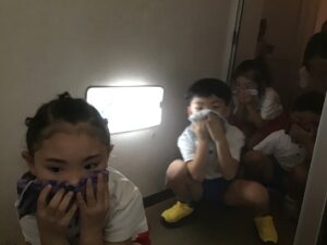 幼稚園での火災避難訓練の経験からハンカチで鼻と口を覆い低い姿勢で避難すると良いということは知っていましたが、実際に煙の中に入るのは初めてで少し緊張しながらの貴重な体験となりました。
