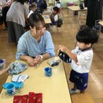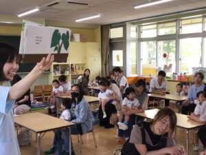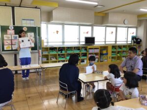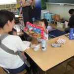 活動は『すがたをかえるたべもの』について考えました。魚や牛乳、大豆はどんな食べ物に変わるのか…ちょっぴり難しかったですが、ヒントをたよりに親子で考え、「そうなんだ~!」と新しいことを知る機会になりました。