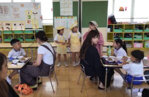ビンゴゲームを楽しんだ後は、いよいよ給食です!自分たちで給食を運ぶ様子も見てもらいました。