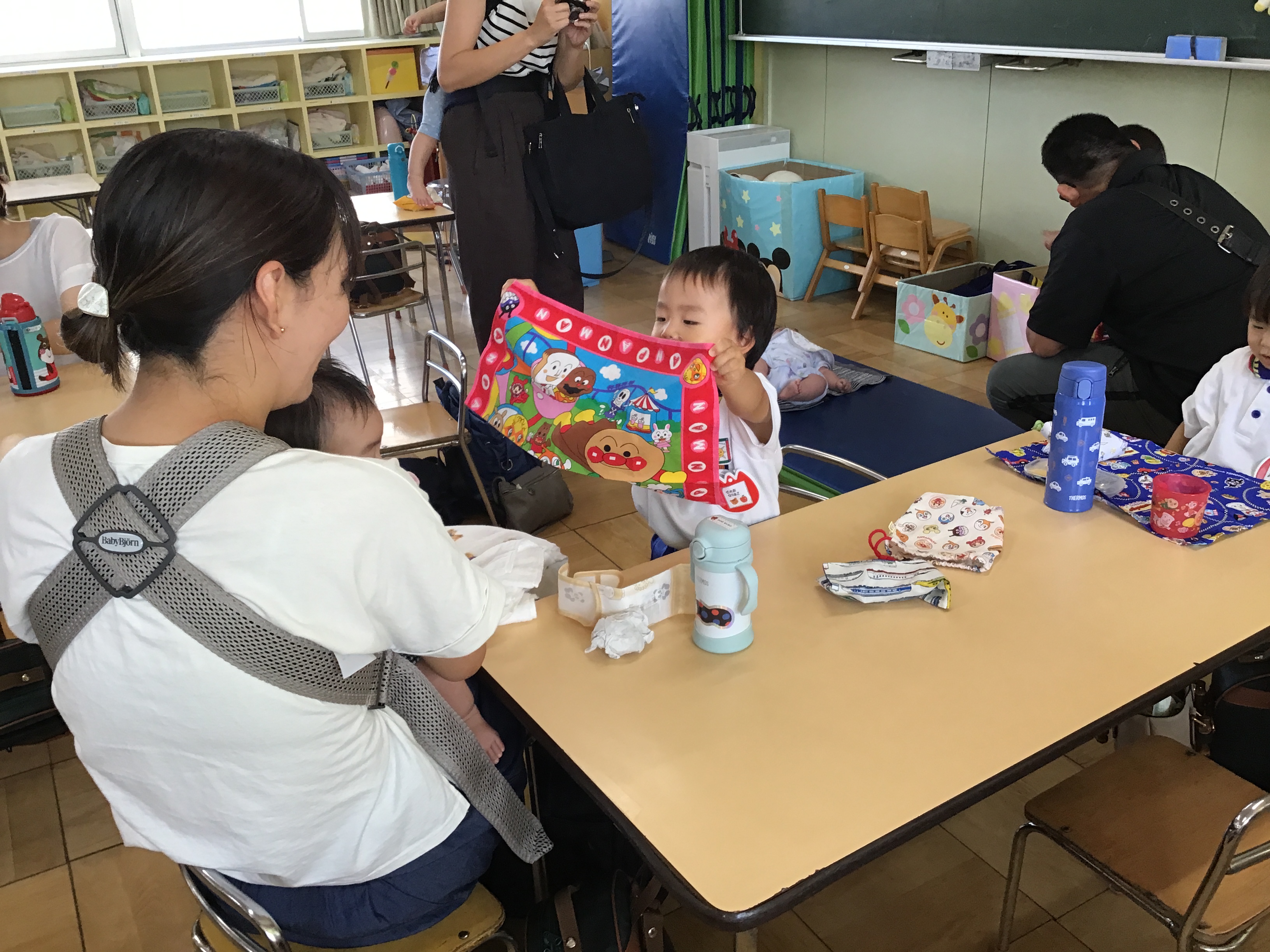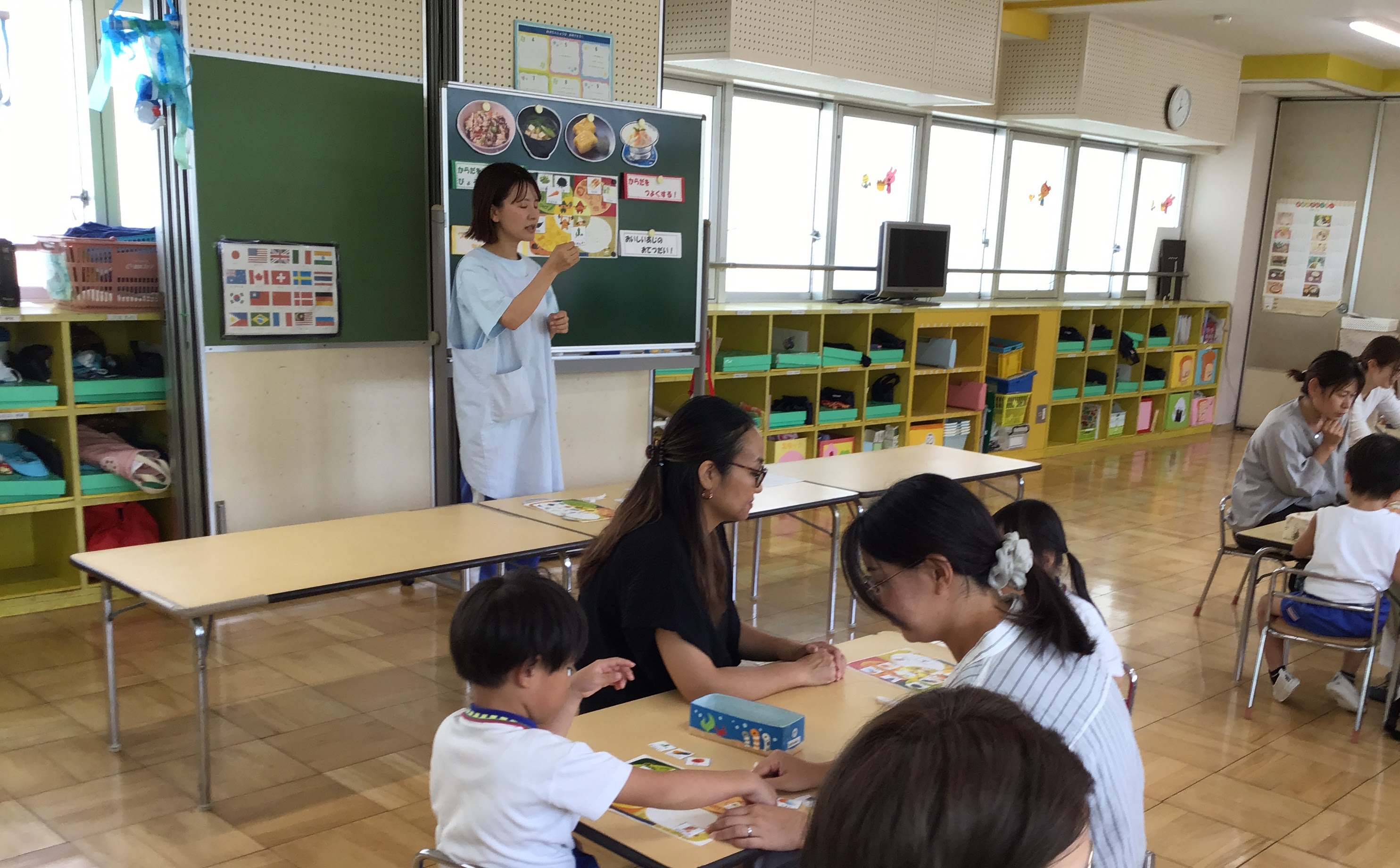食事の前に食育活動も行われました。いちご組ではいろいろな野菜の種類を知ることをテーマに『やさいのうた』の手遊びを親子で楽しんだり、『やさいさん』の絵本の読み聞かせをクイズ形式で行いました。元気よく野菜の名前を答える子ども達を見て、「いろいろな野菜を知っているんだね~」と保護者の方に褒めていただきとても嬉しそうな笑顔を見せていた子ども達でした。