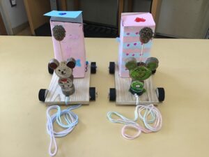 木は角を取ってやすりがかけられており、竹串は先端が切られているなど安全への配慮もされていて、安心して取り組むことができました。これだけの車や、木のパーツを全て鈴木さんお一人でご準備されたと聞き、本当に感謝の気持ちでいっぱいです。私達だけではなかなか準備することができないところもあるので、本当に良い教材、良い経験をさせて頂きました。とても素敵な思い出と作品になりました。ありがとうございました。