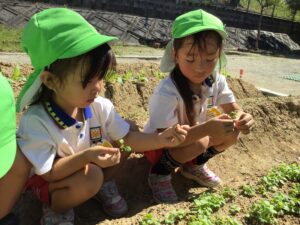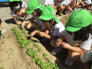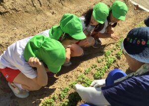 先日、年長組・年中組が撒いた種がたくさんの芽を出し、畑が賑やかくなってきました。