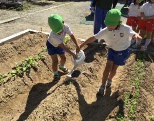 最後に水やりをして今日の農園作業は終了!また観察を続け、気づいたことを伝え合ったり、新しい経験を増やしていけると良いと思っています。次はジャガイモの土寄せかな……😊