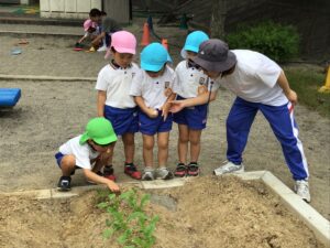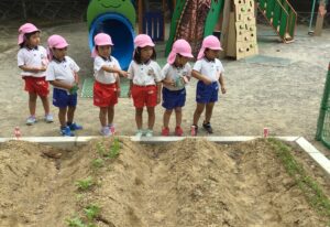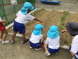 年少組さんが畑を眺めたり、「たくさん出てきた!」「ジャガイモはまだまだだね…」「にんじんの葉っぱ小さいよ」と野菜の様子を気にして、戸外遊びの時間に観察している姿が見られています。