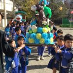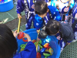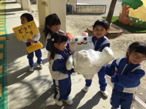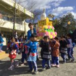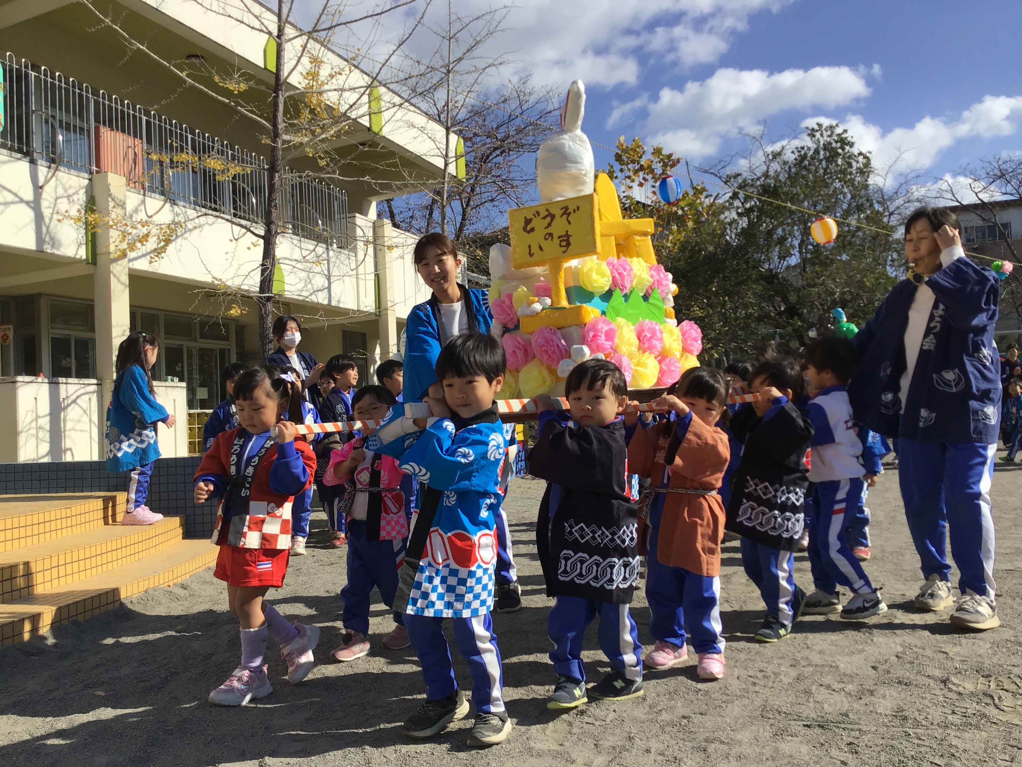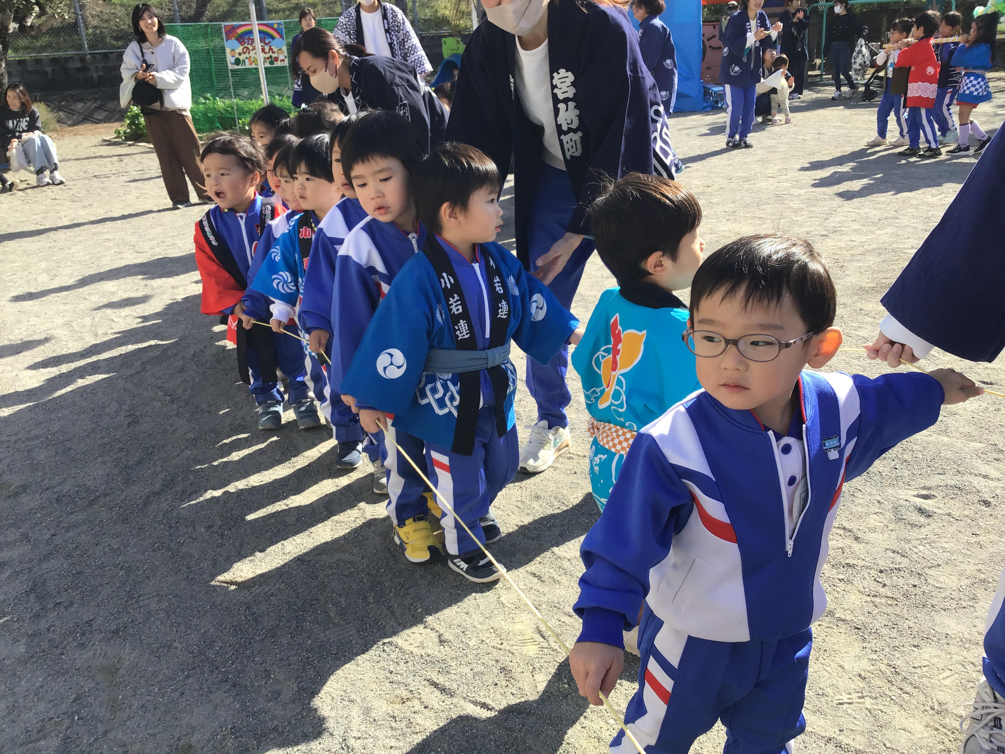 自分達で作ったお神輿を担いで、たくさんの掛け声や声援と共に、「わっしょい!ピッピッ」「わっしょい!ピッピッ」と園庭を練り歩きました♪