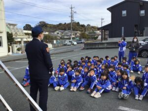 避難訓練では、緊急地震速報を聞き、机の下などに避難、その後ヘルメットをかぶり園庭へ避難する流れでした。4月から毎月、訓練を行ってきているので、避難する時の約束や避難経路も覚えてスムーズに真剣に取り組めるようになり、訓練後の講評では消防署員の方からもお褒めの言葉を頂きました。