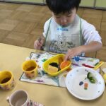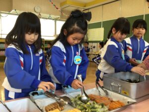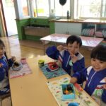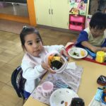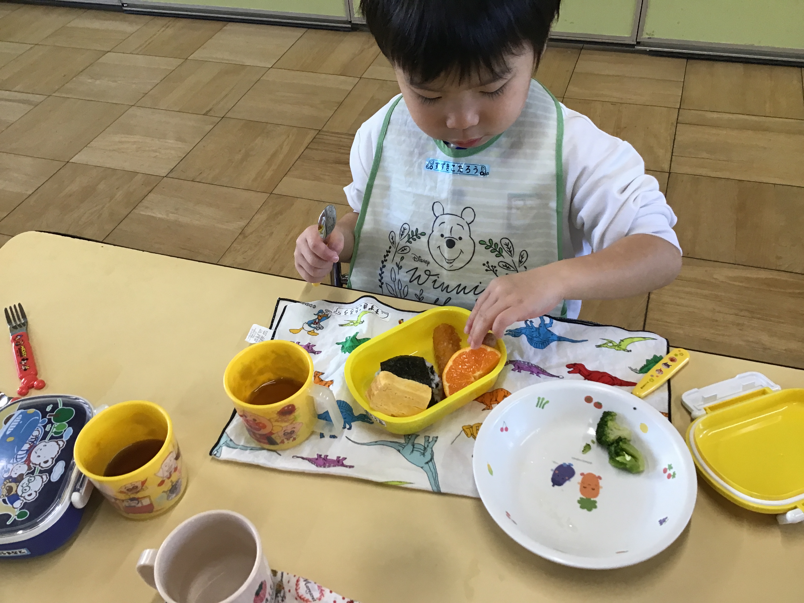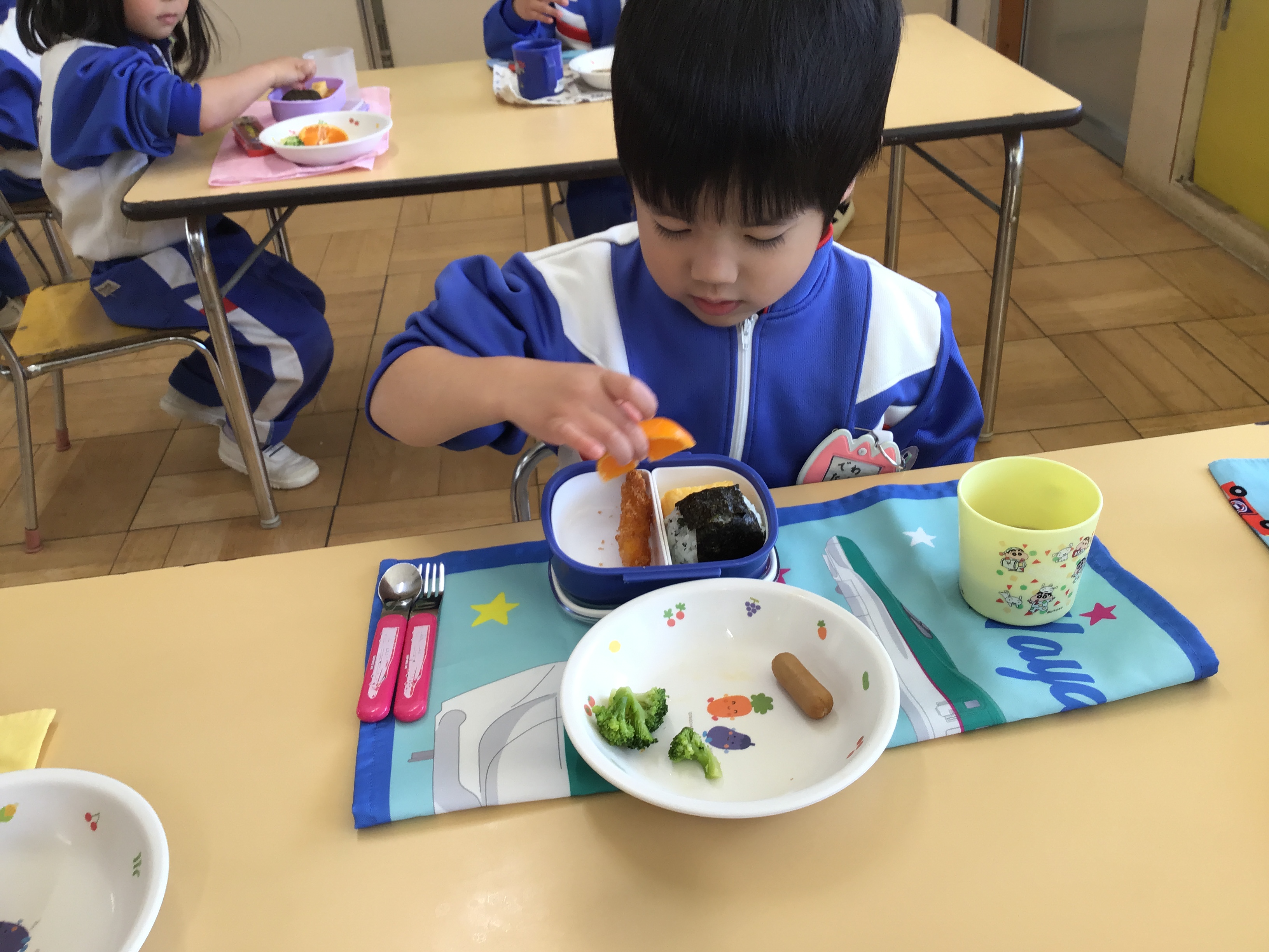 年長・年中組はトングを使って、年少・いちご組は先生がお皿に乗せてくれたものを自分でお弁当箱に詰めました。
