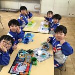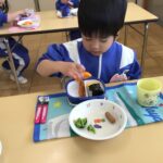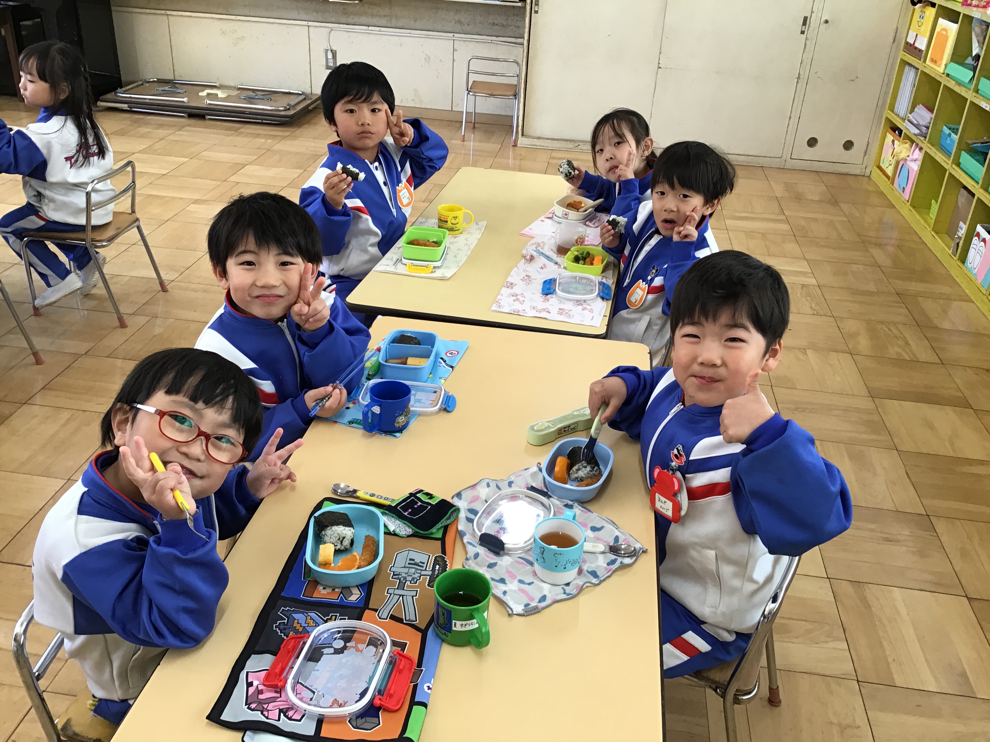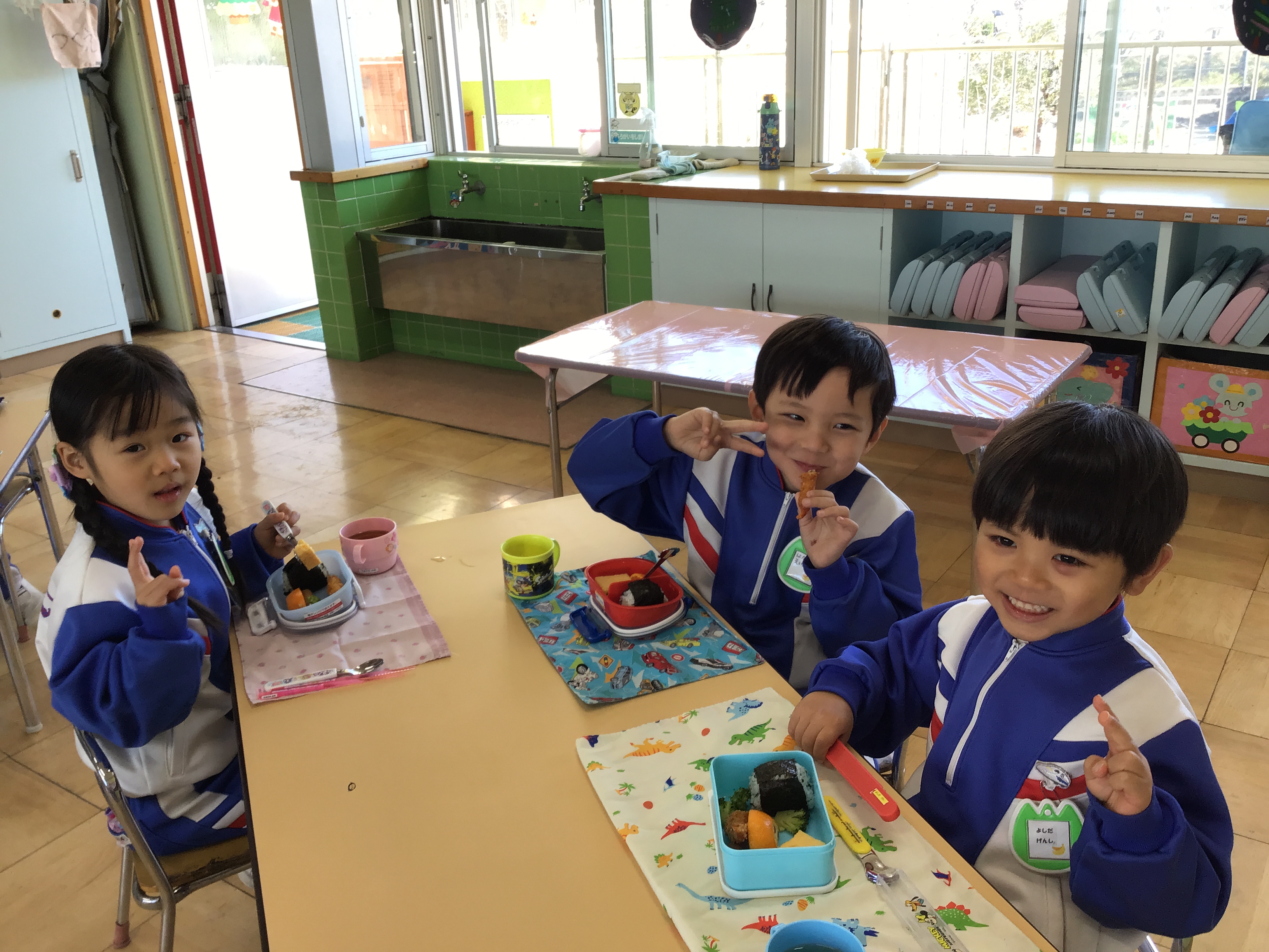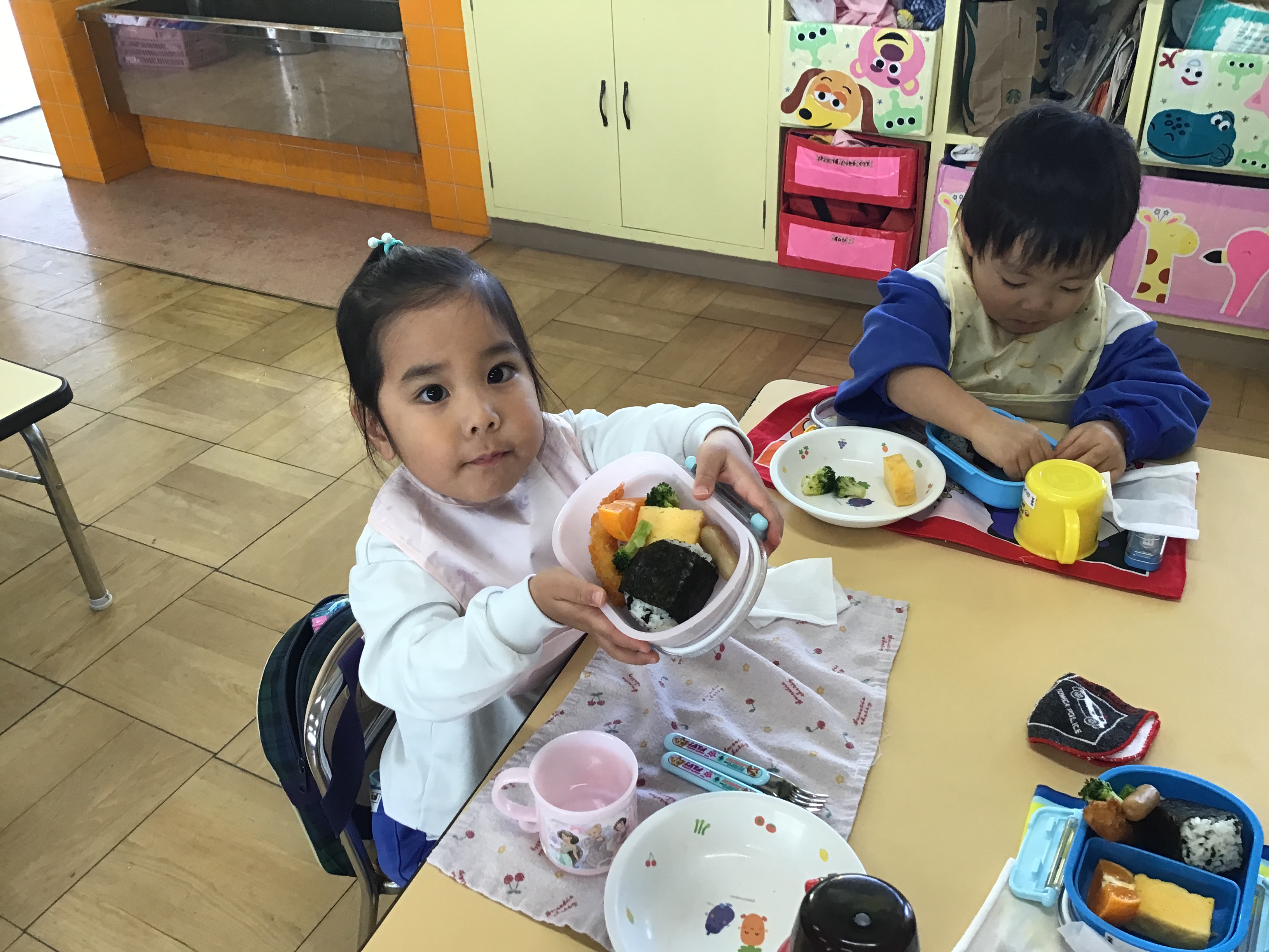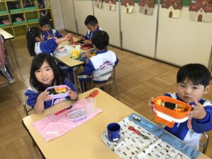 今日のお楽しみはもう1つ!お楽しみ給食です♪お家から持ってきた空のお弁当箱に、自分達でおにぎりやおかずを詰めてオリジナルランチを作りました。