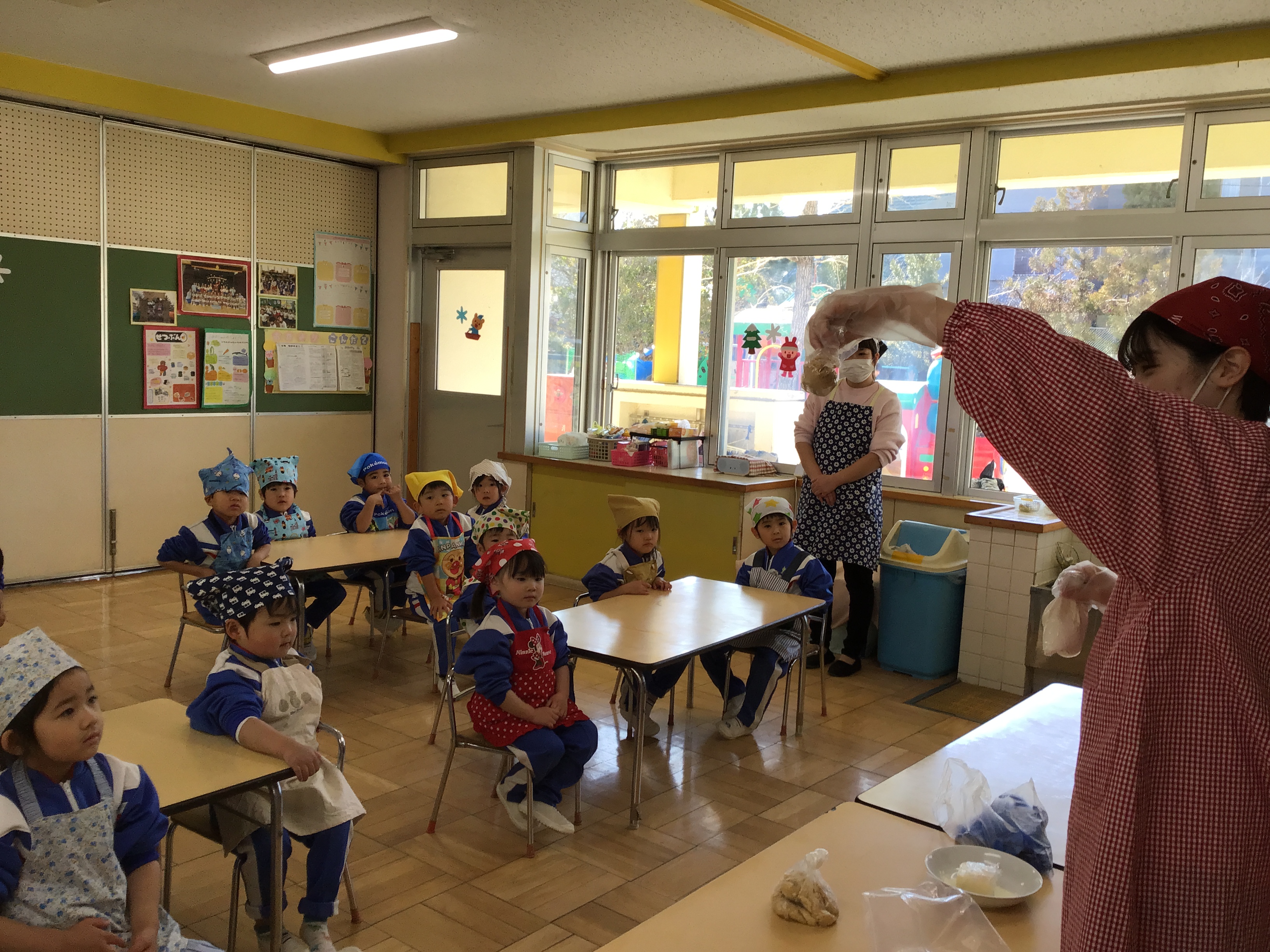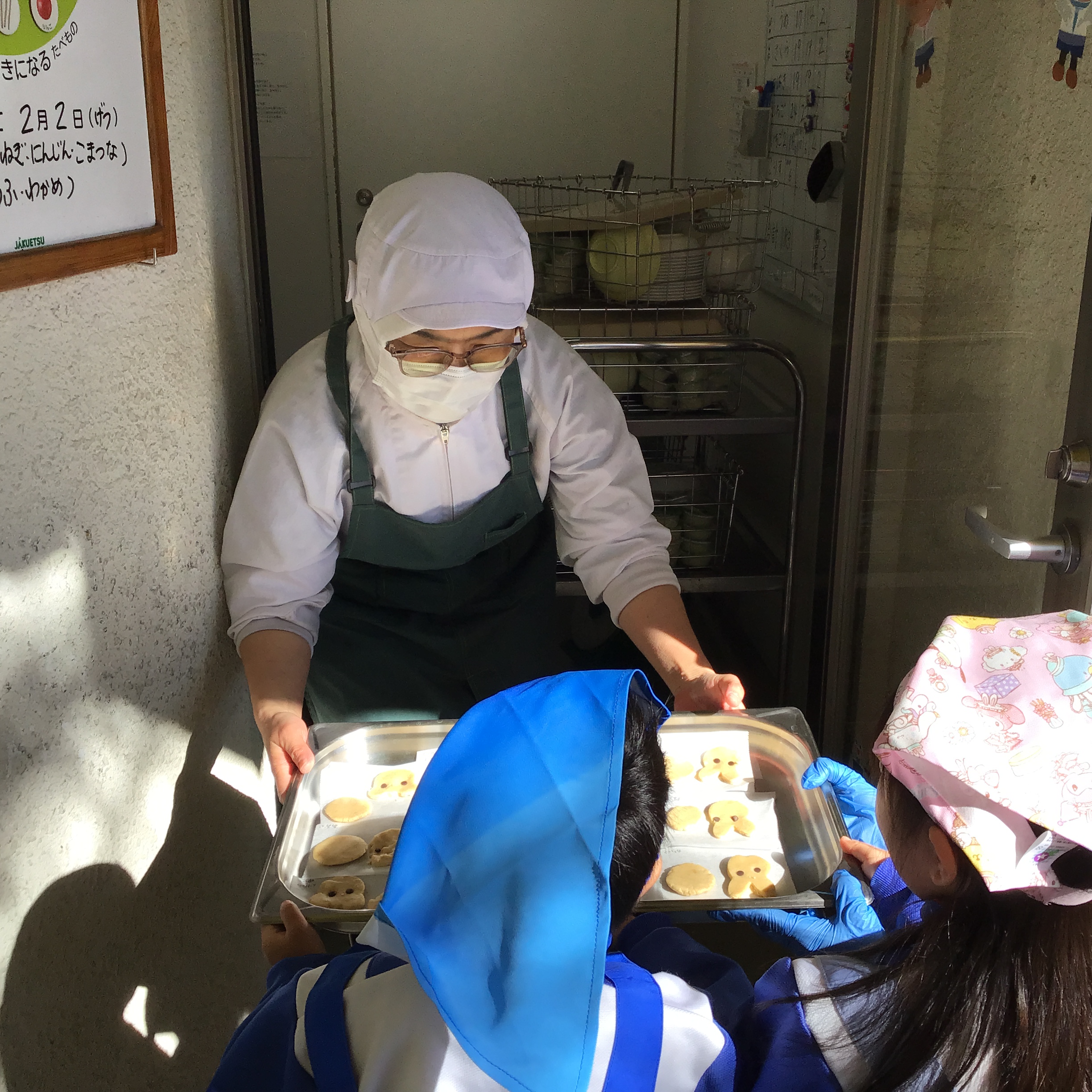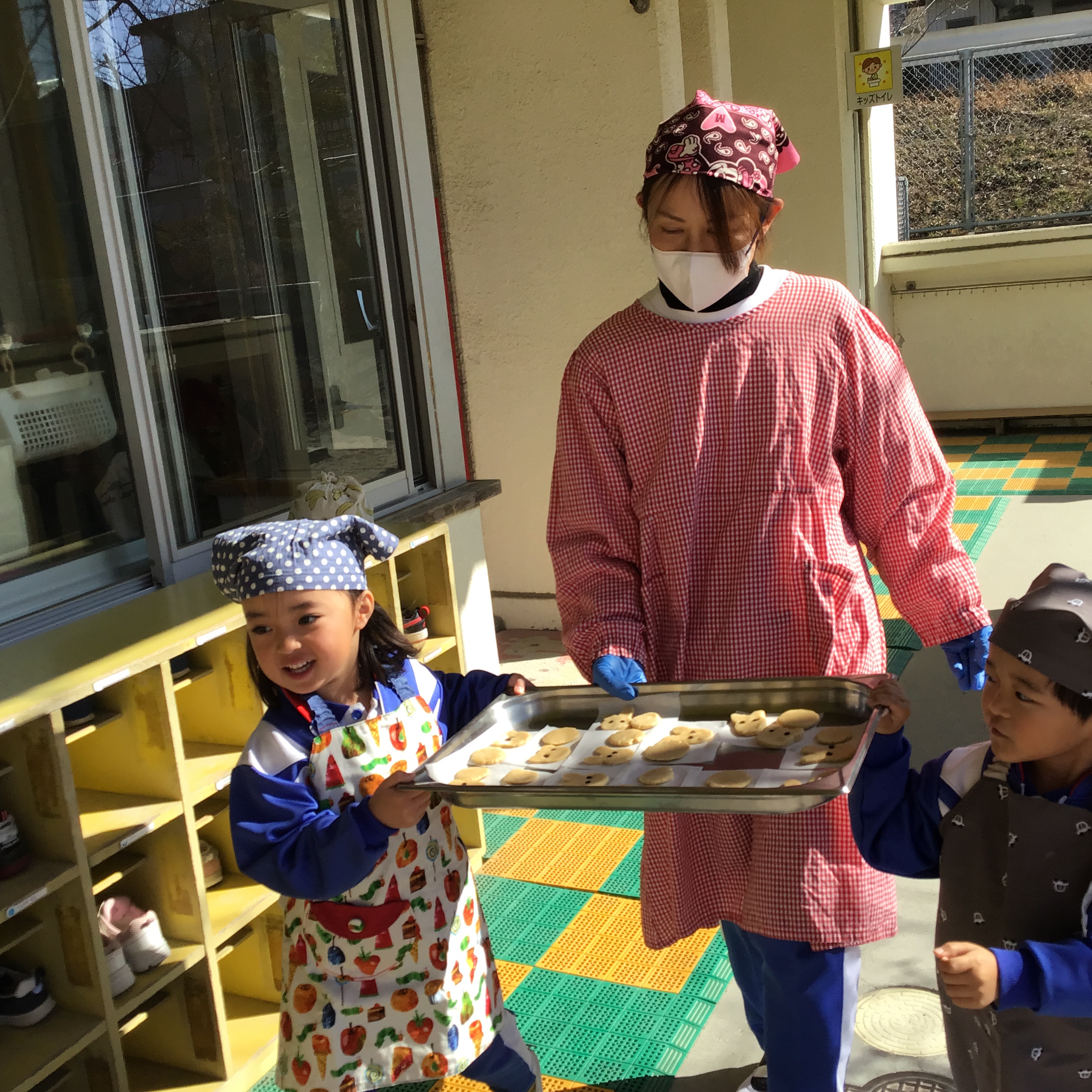 当日は「エプロン持ってきたよ〜」「早くクッキー作りたいな!」とワクワクしながら登園してきてくれました。