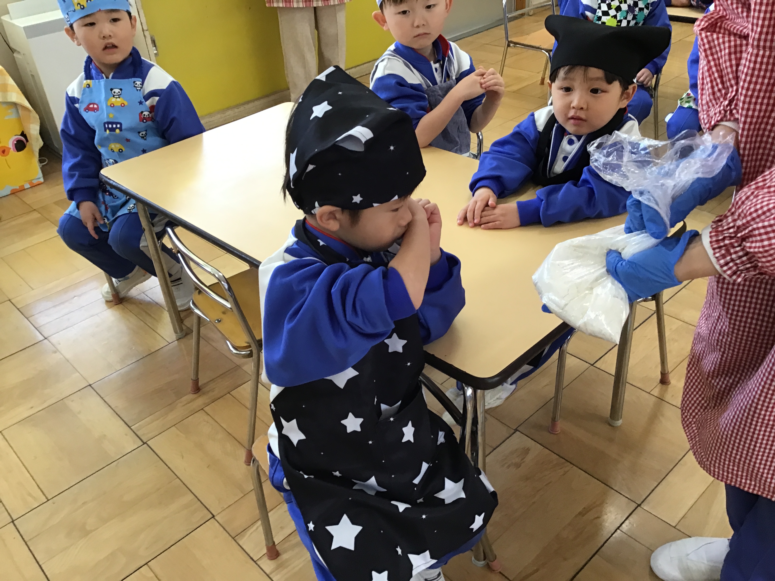 そして、手をきれいに洗って、エプロンと三角巾を身につけていよいよクッキー作りのはじまり!