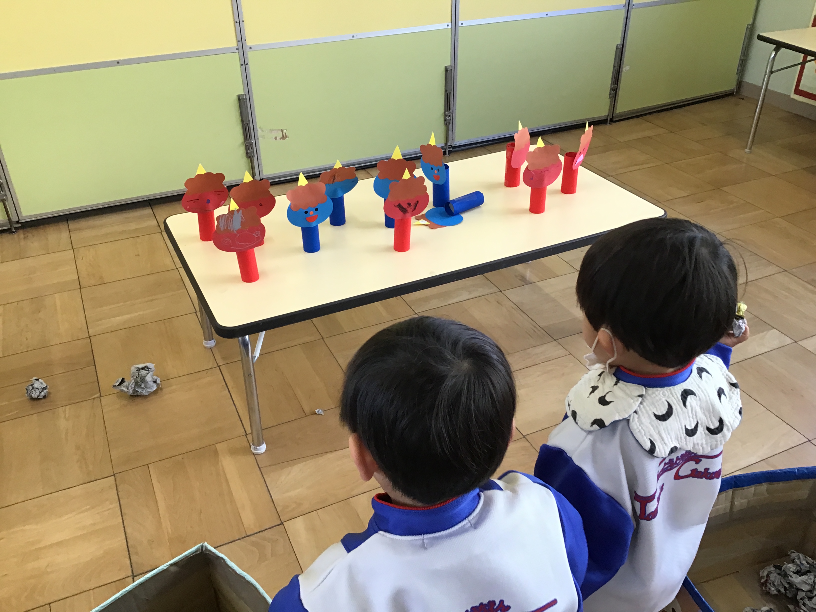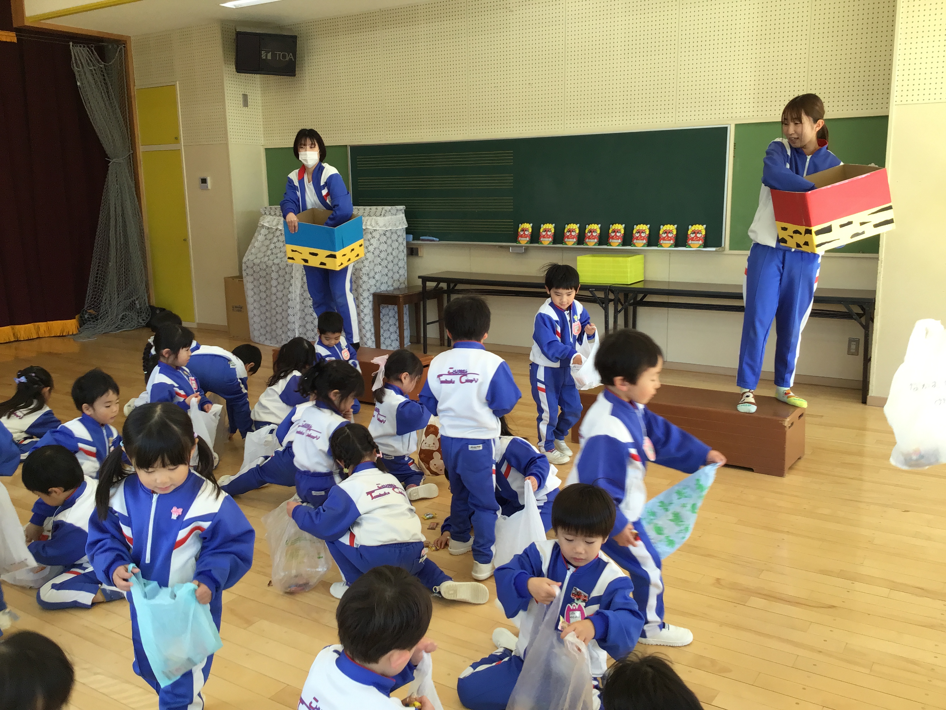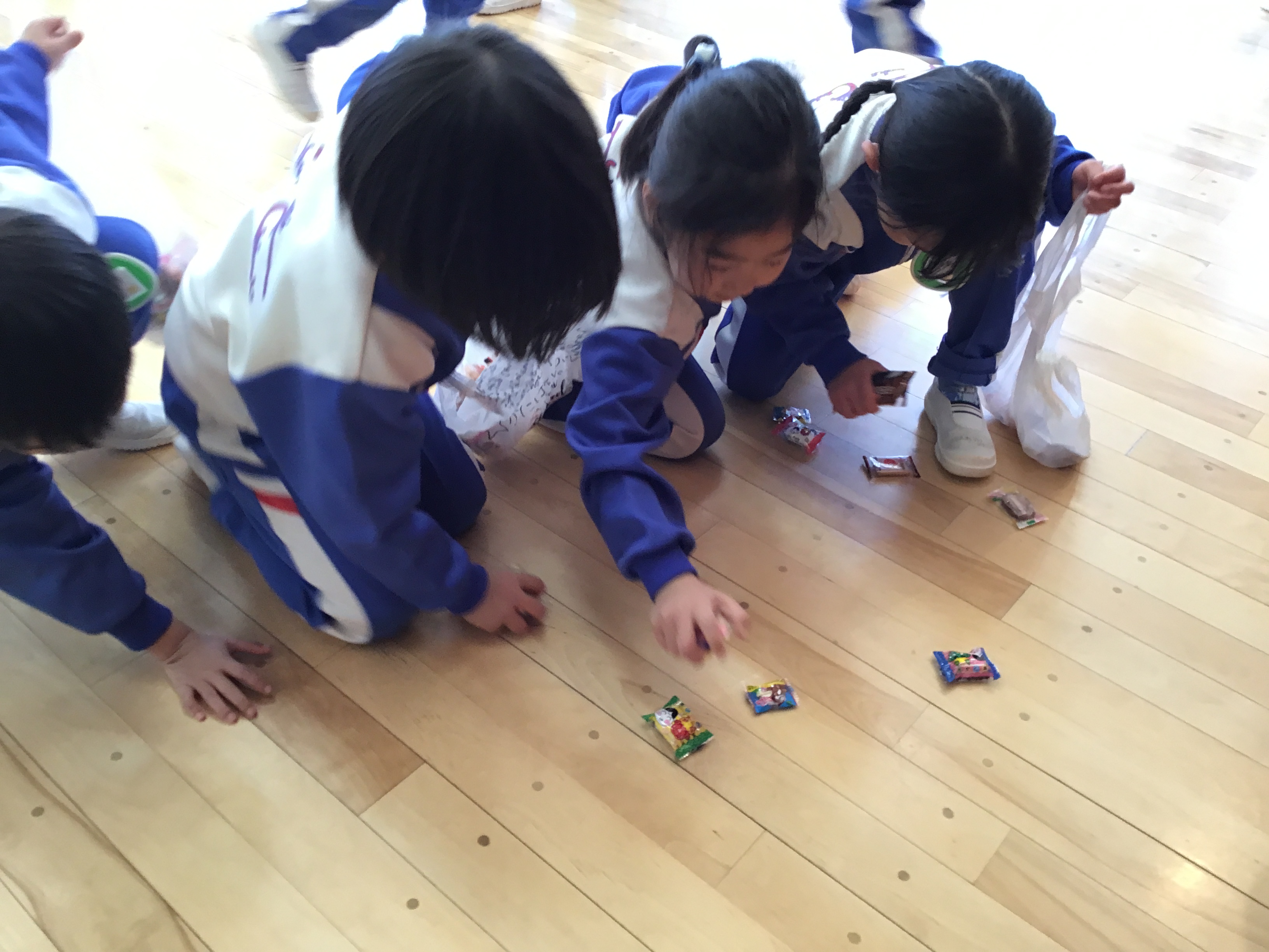 鬼退治に成功した子ども達は、ほっとして力が抜けてしまっていましたが、お楽しみのお菓子まきが始まると、先ほどとは別人のように夢中になってお菓子を拾ったり、自分の好きなお菓子を選んだりと楽しい時間を過ごすことが出来ました。
