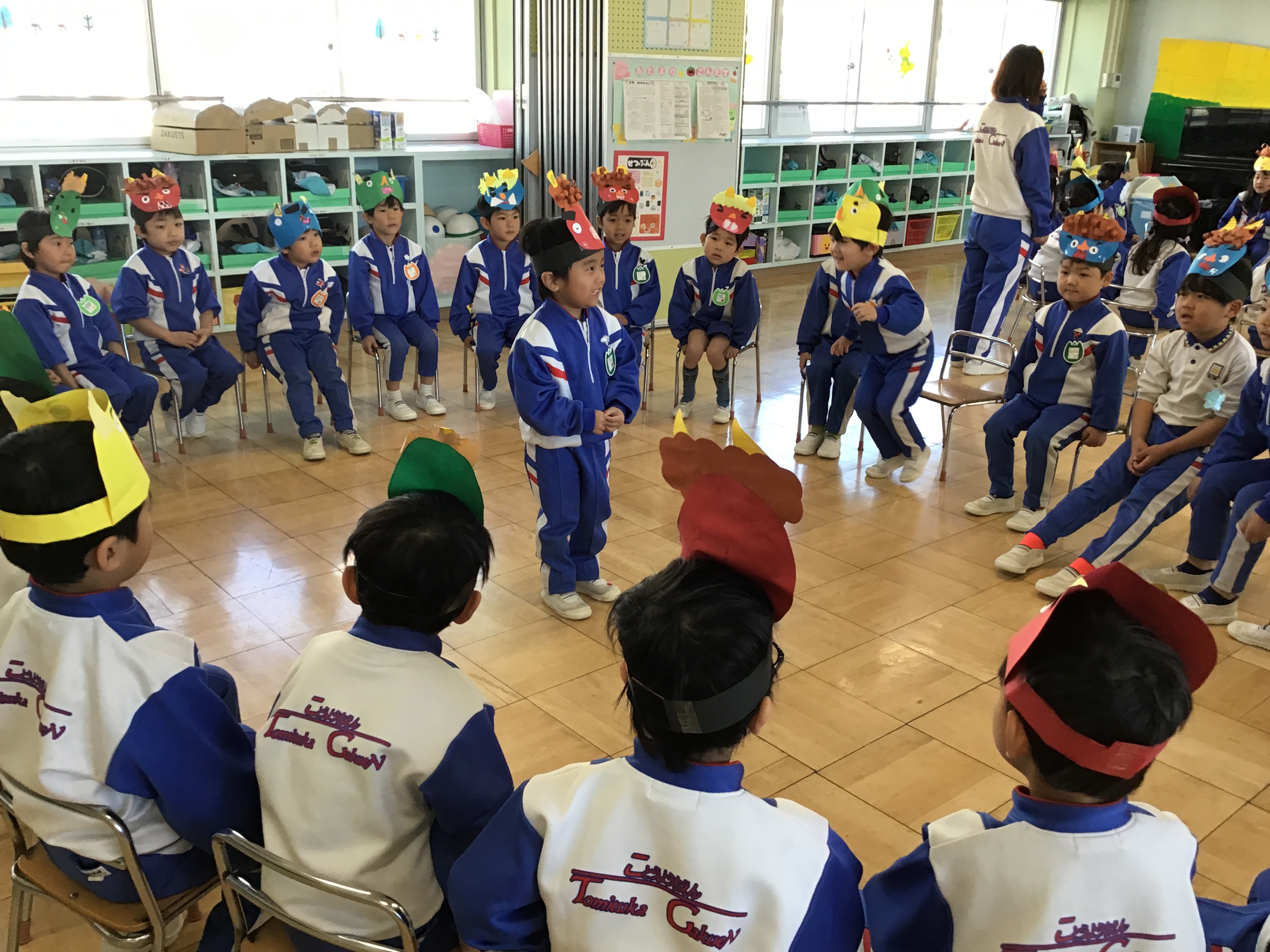 幼稚園でも心の中に住んでいる、怒りんぼ鬼やイヤイヤ鬼、泣き虫鬼など様々な鬼を退治して、一年間健康に過ごせるように豆まきを行うことを伝えていると・・・どこからか大きな足音が・・・